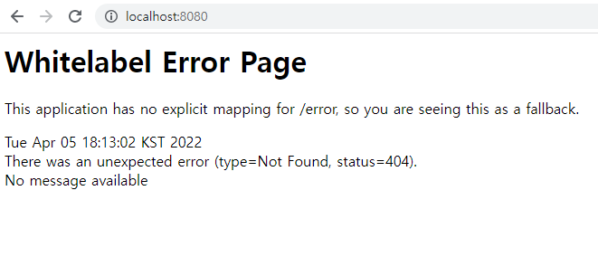 브라우저로 http://localhost:8080 을 입력하여 아래의 페이지가 표시되면 정상적으로 웹페이지까지 로딩이 된 것이다.