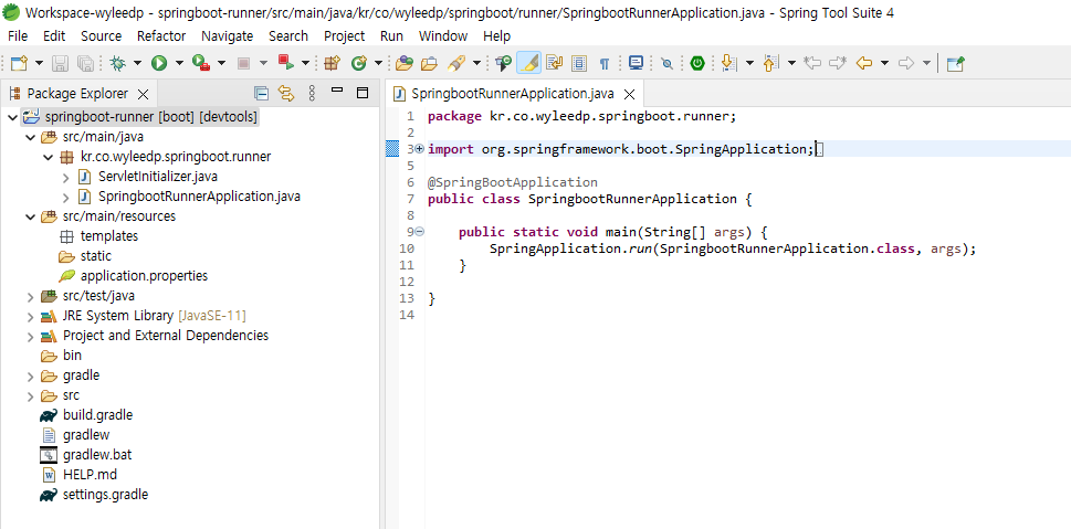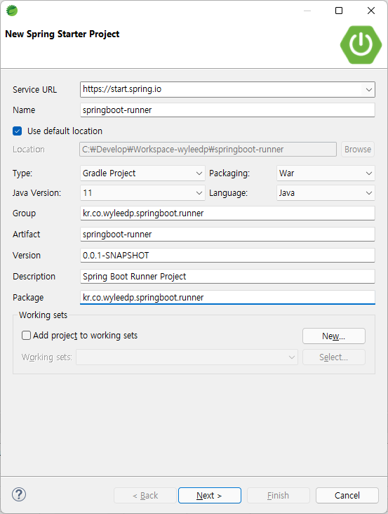 2. springboot-runner 라는 아주 단순한 앱 정보를 입력(JDK 11, Gradle, WAR 로 설정)