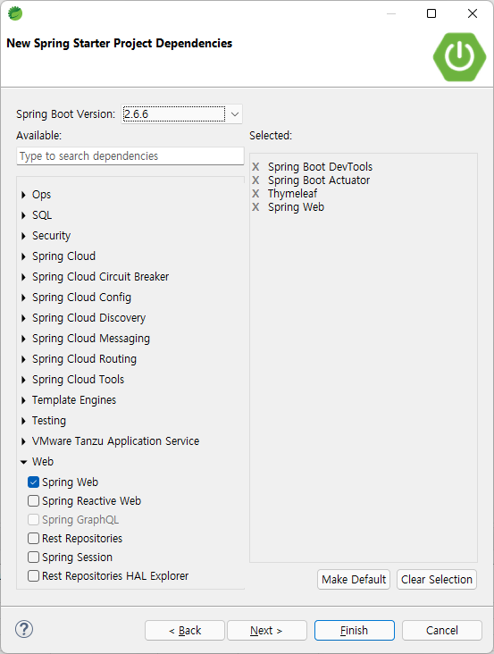 Spring Boot Version : 2.6.6(stable 버전을 기본으로 선택해주는 것 같다.)