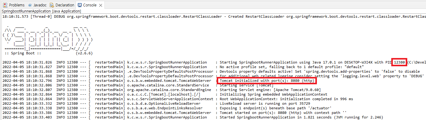콘솔창을 확인하면 프로세스ID는 12380 이고 웹포트는 8080 인 것을 확인할 수 있다.