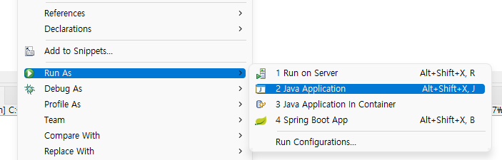 SpringbootRunnerApplication.java 파일을 열고 우클릭 > Run As > Java Application 을 실행하면 Application이 구동된다.
