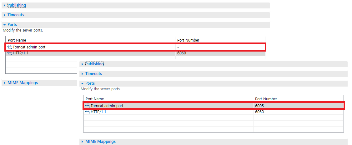 설정을 완료한 톰캣 서버를 더블클릭하여 포트설정을 입력하거나 다른 포트로 변경하면 에러는 해결된다.