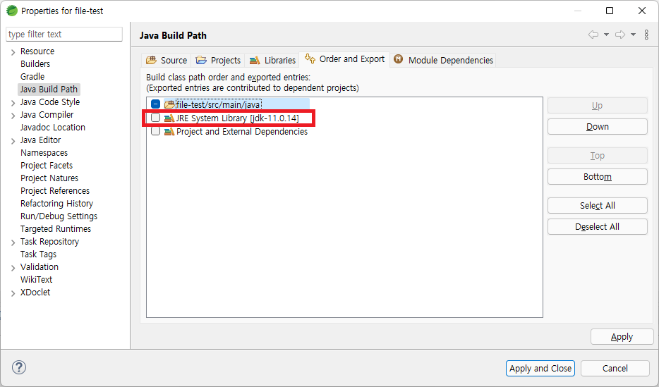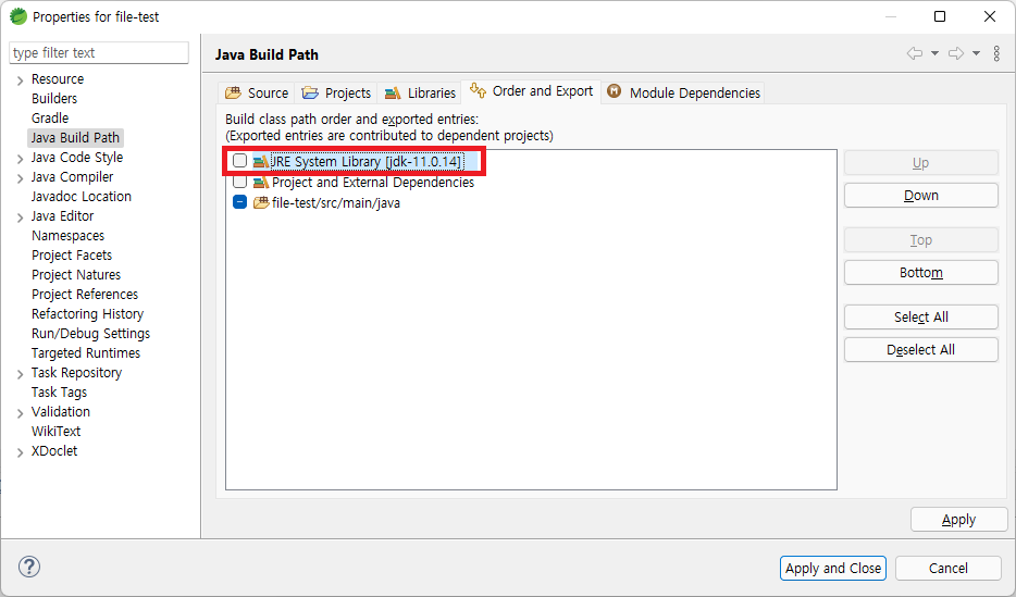 JRE가 설정이 안되어 있거나 Build 순서가 첫번째로 설정이 안되어 있으면 발생하는 문제로 파악되었다.