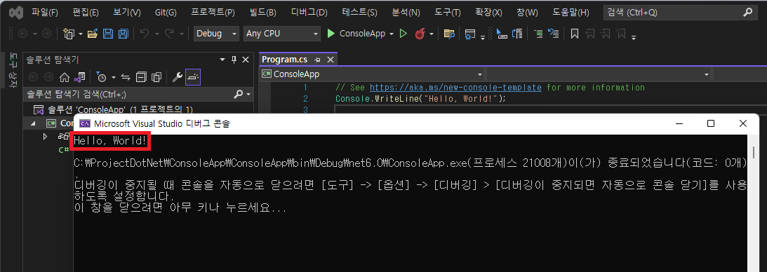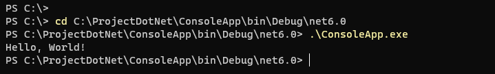 윈도우 터미널에서 C:\ProjectDotNet\ConsoleApp\bin\Debug\net6.0 폴더로 이동한 뒤 ConsoleApp.exe 을 실행해도 똑같은 결과가 출력된다.