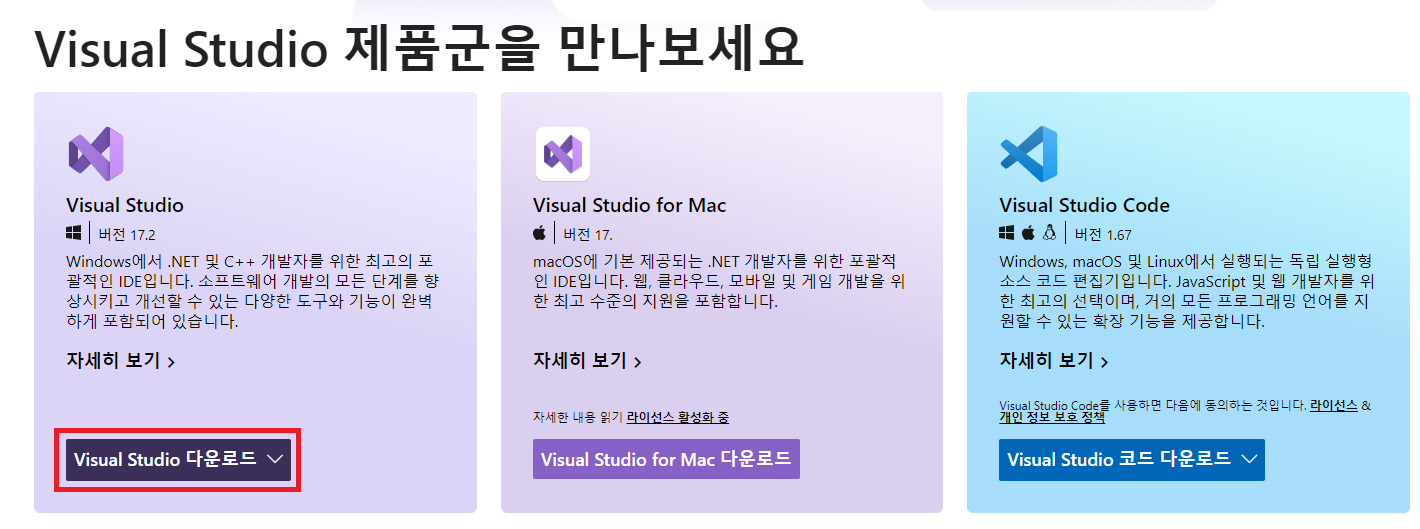 https://visualstudio.microsoft.com/ko/ 접속하여 OS에 맞는 Visual Studio 다운로드