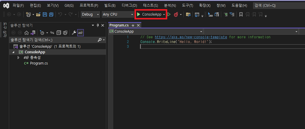 자동으로 Console.WriteLine("Hello, World!"); 코드가 생성되며 상단에 ConsoleApp 재생버튼을 클릭하면 프로그램이 실행된다.