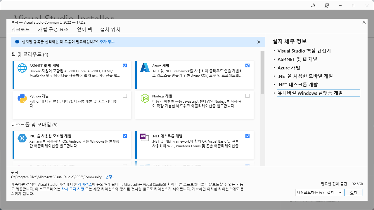 해당 항목을 다 설치하려면 32.6GB 가 필요하다. (역시 노트북 SSD 용량은 1TB 이상을 해야 마음이 편하다.)