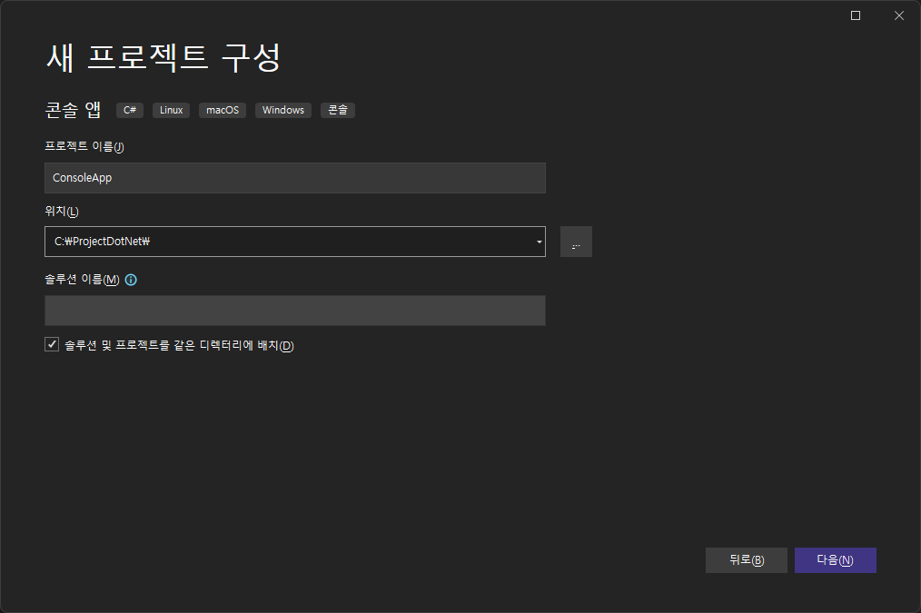 프로젝트 이름 : ConsoleApp, 프로젝트 위치를 생성/선택한 후 다음