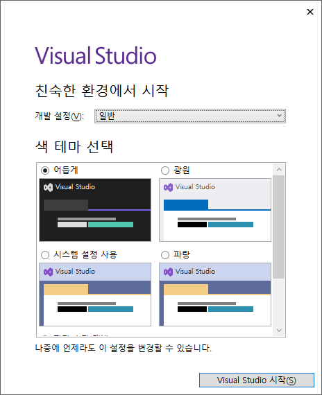 개발 설정 : 일반, 테마 : 어둡게 - Visual Studio 시작