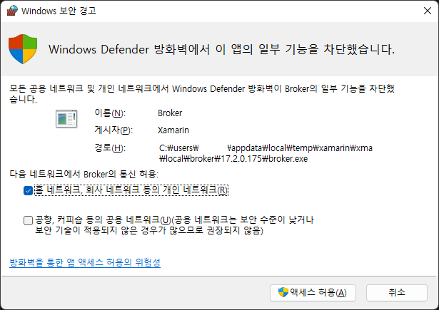 처음 실행시 Window 보안 경고가 발생된다. 엑세스 허용 클릭