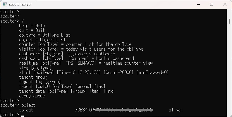 1. scouter-server 실행 후 콘솔에서 엔터를 입력하면 scouter> 명령어 창이 표시된다.