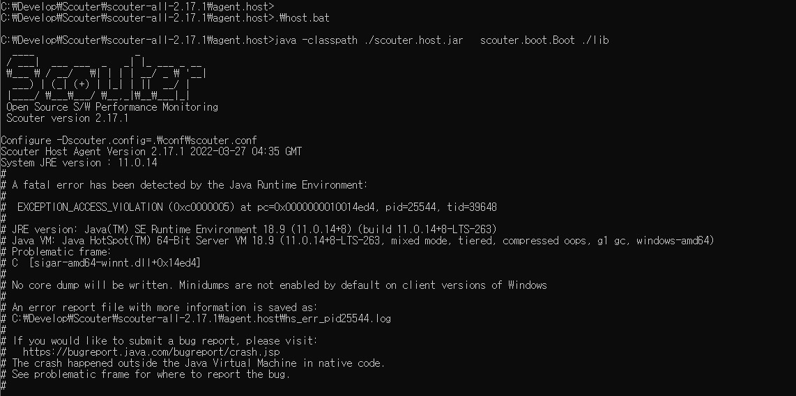 윈도우 11에서 scouter의 agent.host 를 실행하면 심각한 JAVA에러가 발생하여 실행이 되지 않는 문제가 발생되고 있다.