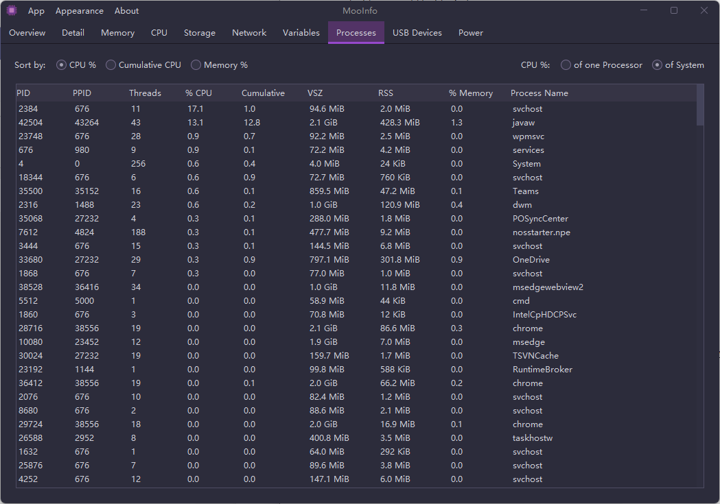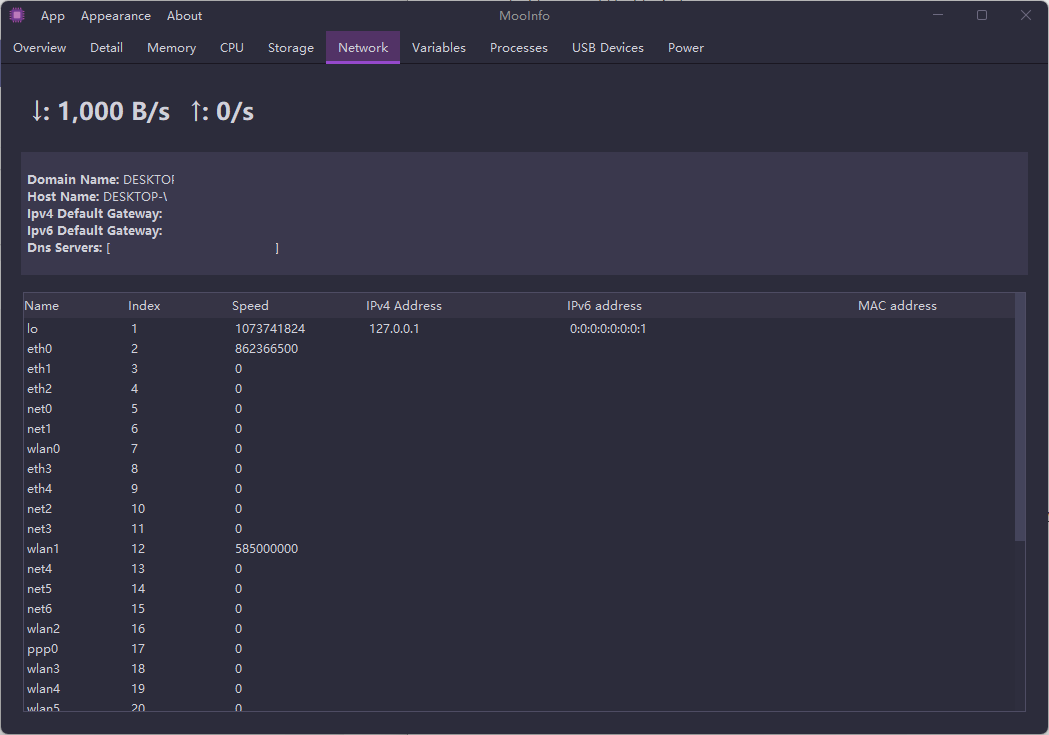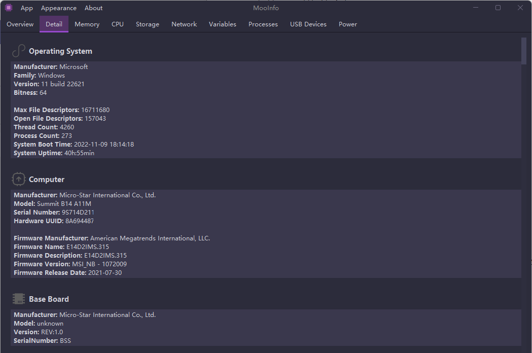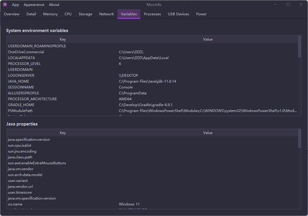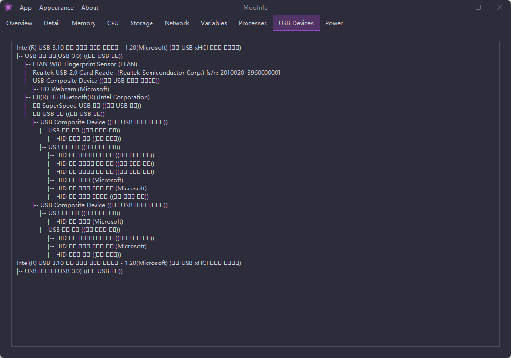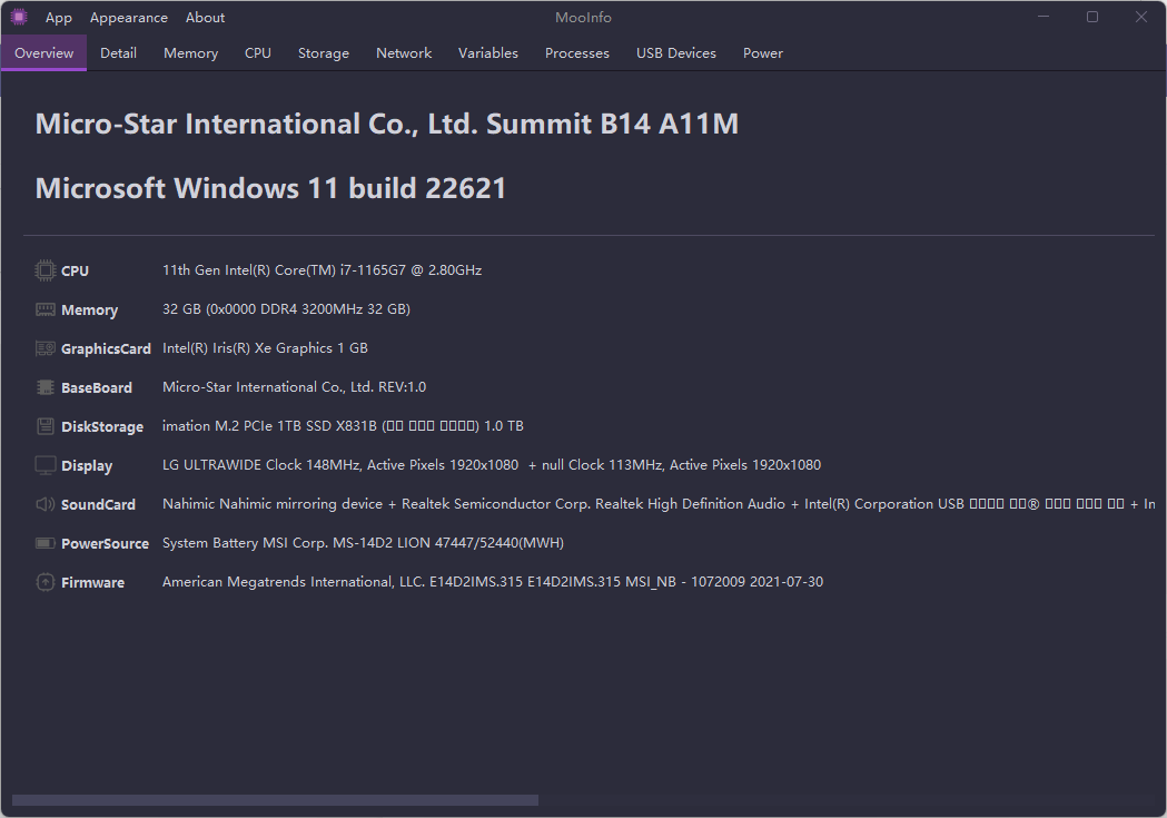 - Overview, Detail, Memory, CPU, Storage, Network, Variables, Processes, USB Devices, Power - 총 10개 탭으로 구성