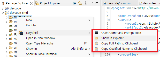 EasyShell 플러그인을 설치/사용하면 cmd창을 해당 폴더로 실행을 해주는 기능, 탐색기를 실행하는 기능, 선택한 소스의 전체경로복사, 선택한 소스의 부분경로를 복사해주는 기능을 쉽게 사용할 수 있다.