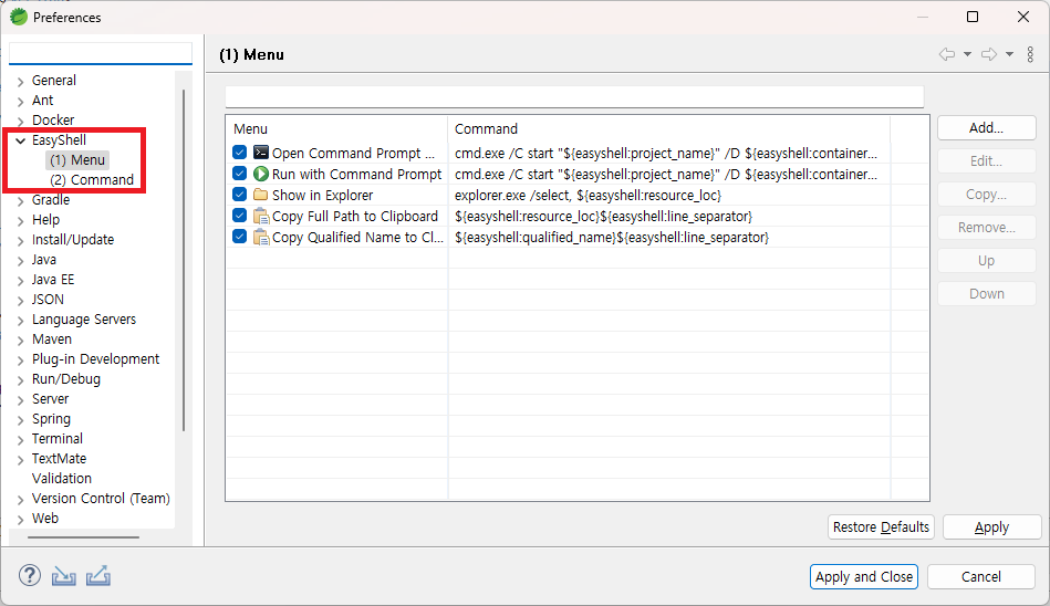 Menu > Window > Preferences > EasyShell 에서 개발자가 원하는대로 기능을 추가하고 수정할 수 있다.