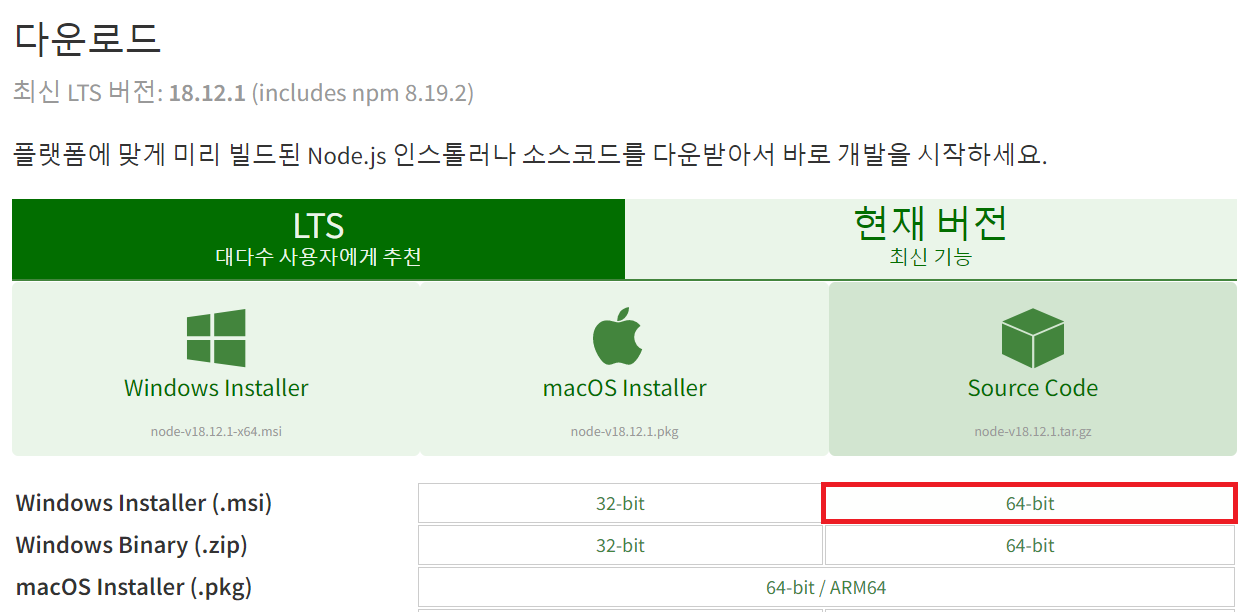 사이트 https://nodejs.org/ko/download/ 접속하여 OS에 맞는 node.js 설치파일 다운로드