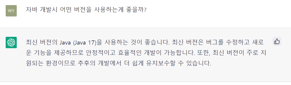Java 17은 LTS 버전이고 LTS중에 최신버전으로 알고 있어 신규 프로젝트시 17을 사용해야 겠다고 생각했는데 ChatGPT에서 정확히 답변을 해준 것이다.