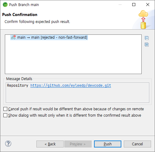 STS를 이용하여 GitHub에 main 브랜치 push시 에러발생 - "rejected - non-fast-forward"