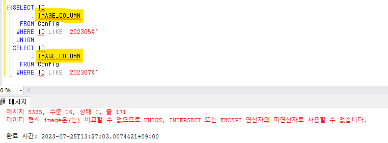 에러메세지 : 데이터 형식 image은(는) 비교할 수 없으므로 UNION, INTERSECT 또는 EXCEPT 연산자의 피연산자로 사용할 수 없습니다.