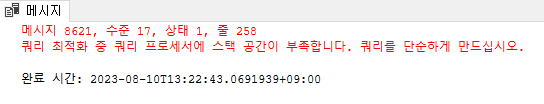 메시지 8621, 수준 17, 상태 1, 줄 258 쿼리 최적화 중 쿼리 프로세서에 스택 공간이 부족합니다. 쿼리를 단순하게 만드십시오.