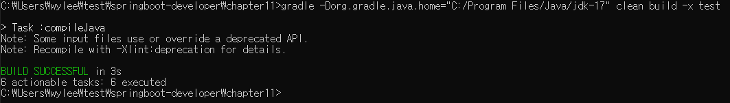 C:\Users\wylee\test\springboot-developer\chapter11>gradle -Dorg.gradle.java.home="C:/Program Files/Java/jdk-17" clean build -x test