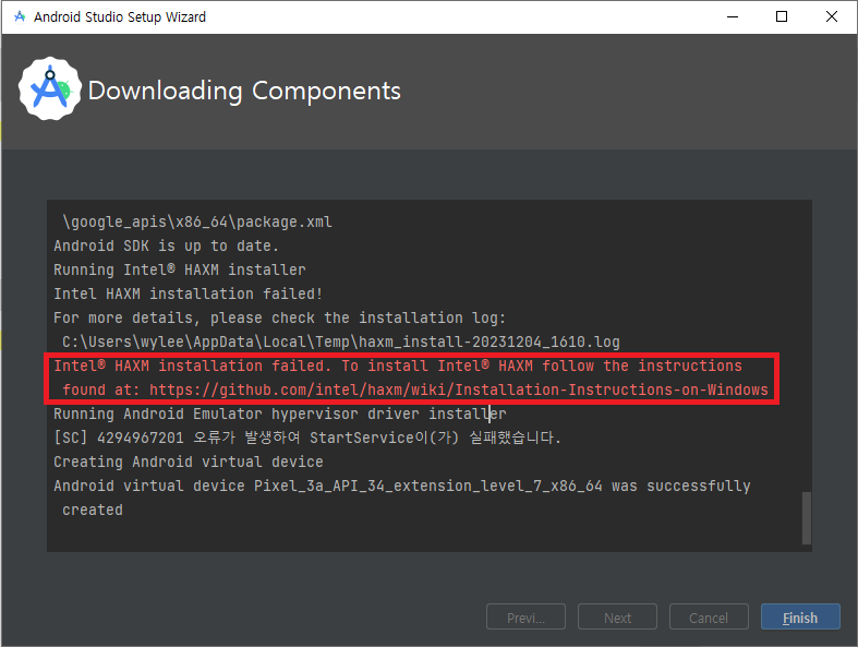 안드로이드 스튜디오 설치시 Intel® HAXM installation failed 발생
