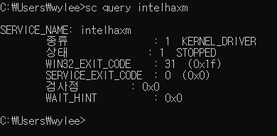윈도우 커맨드로 sc query intelhaxm 를 입력하여 서비스를 확인