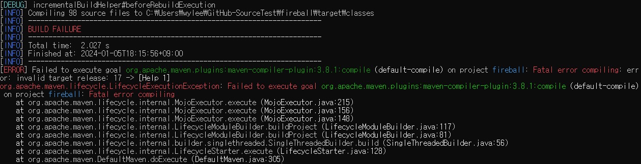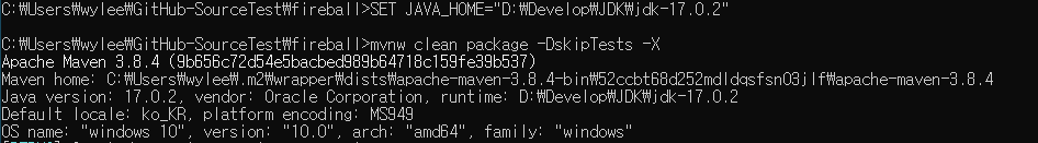 메이븐을 실행하려는 PC의 JAVA_HOME은 jdk 11로 설정. 파이어볼의 오픈소스는 jdk 17로 구현되어 있어 컴파일이 안되는 문제로 확인