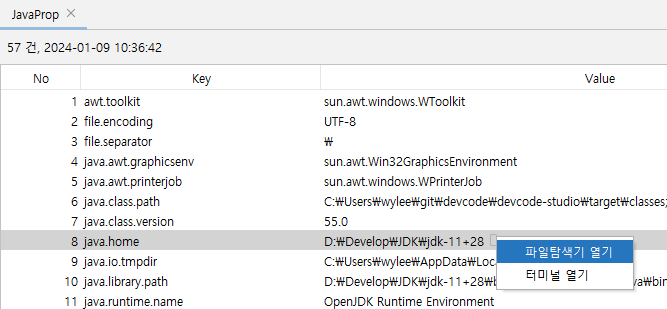 JAVA/Swing 환경에서 윈도우 탐색기 또는 커맨드창을 실행하면 유용할 것 같아 devcode-stuio JavaProperties 내용을 조회하는 기능에 적용하였다.