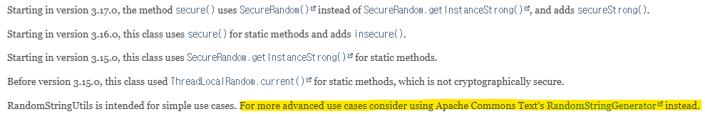 난수생성관련하여 보안문제로 계속 수정되었던것 같고 앞으로는 apache-commons-text 의 RandomStringGenerator를 사용하도록 권고하고 있다.