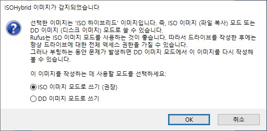 2. ISO 이미지 모드로 쓰기 (권장) 선택 후 OK