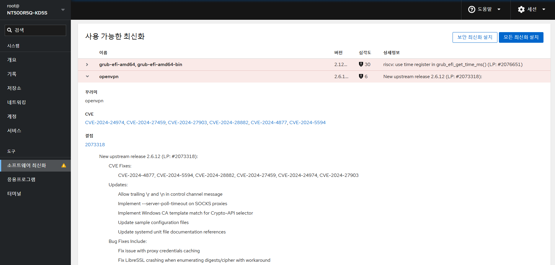 cockpit 를 사용하면 보안에 취약한 소프트웨어를 화면에서 바로 확인할 수 있고 업데이트를 할 수 있다.