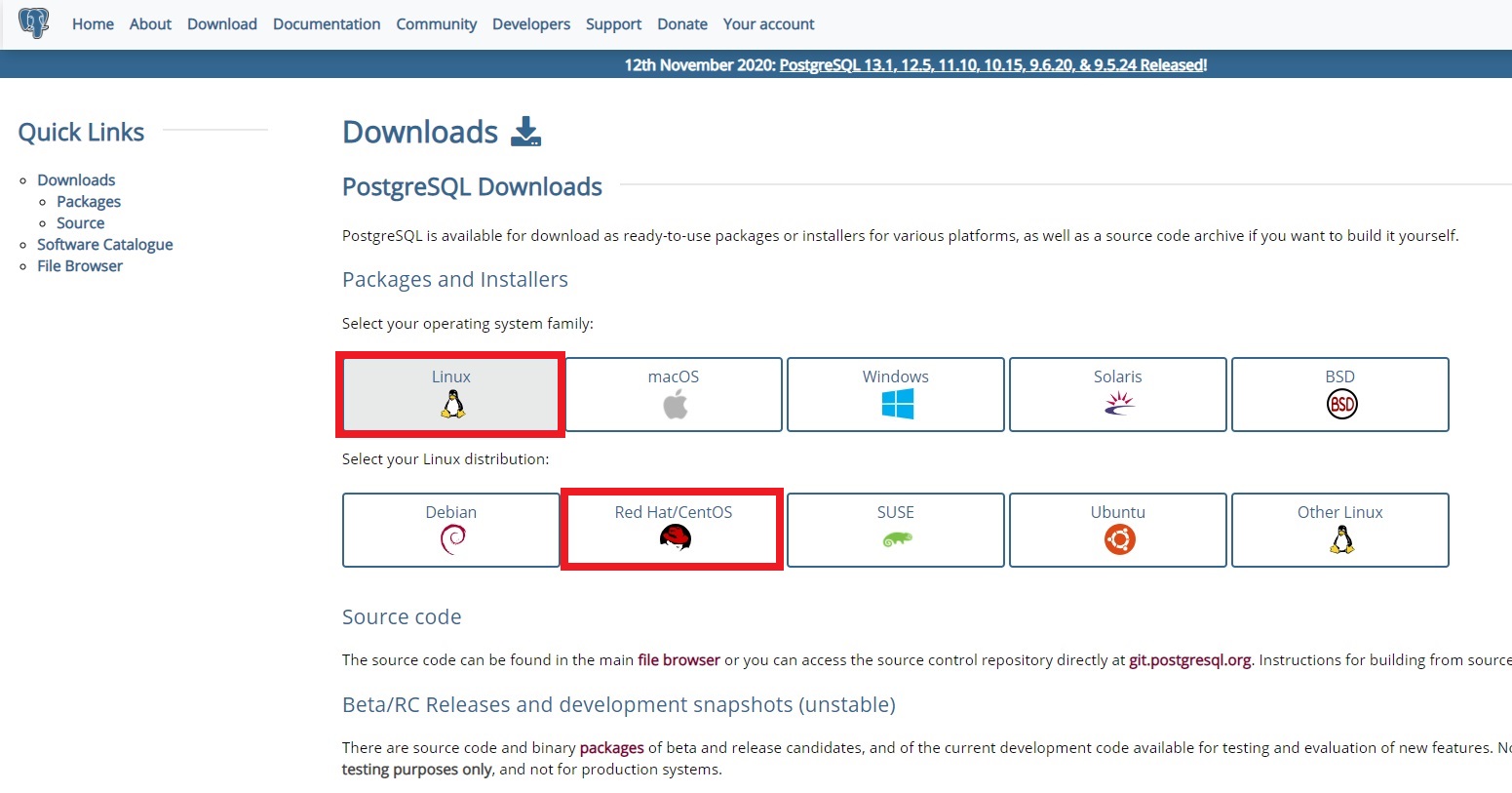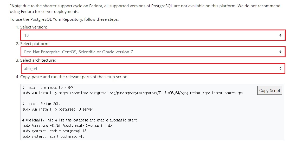 2021년 1월 7일 기준으로 Postgresql 최신 13 버전(13.1) - CentOS 7, x86_64bit 을 선택하면 설치할 수 있는 스크립트를 확인할 수 있다.