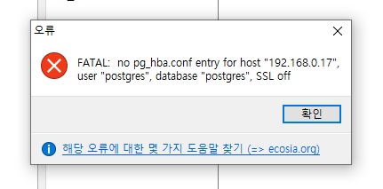 FATAL : no pg_hba.conf entry for host "192.168.0.17", user "postgres", database "postgres", SSL off