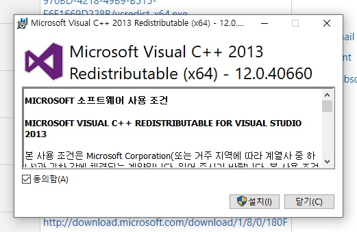 에러창이 표시되면 URL로 들어가 Visual-C 관련 패키지를 설치해 주면 된다.