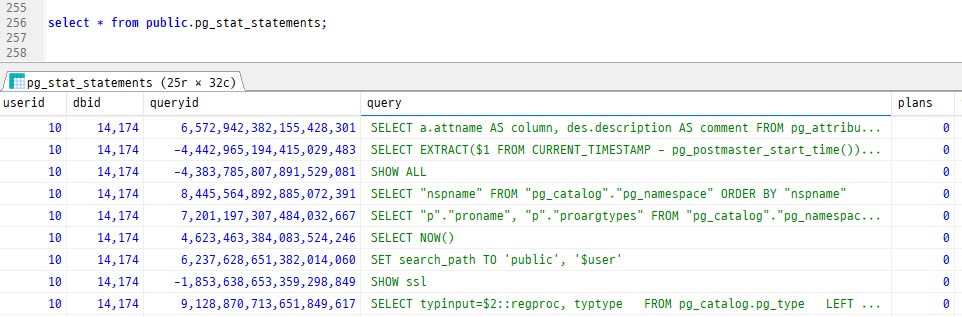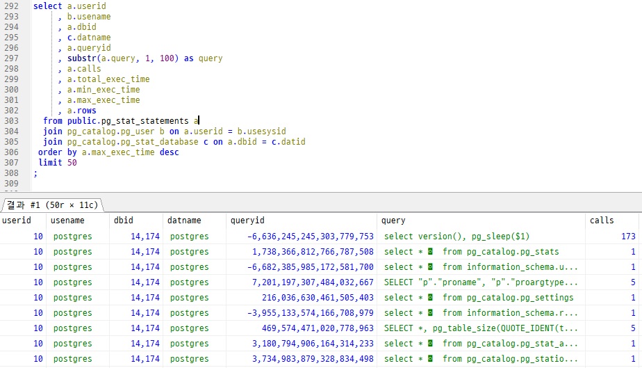 - 다만 pg_stat_statements 적용을 하려면 서비스 재기동이 필요하기 때문에 초기 세팅시 적용하는 것이 좋을 듯하다.