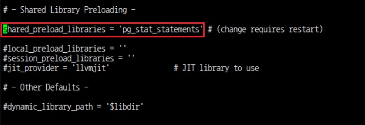 shared_preload_libraries 설정의 변경사항을 적용하려면 postgresql 를 재기동하여야 한다.