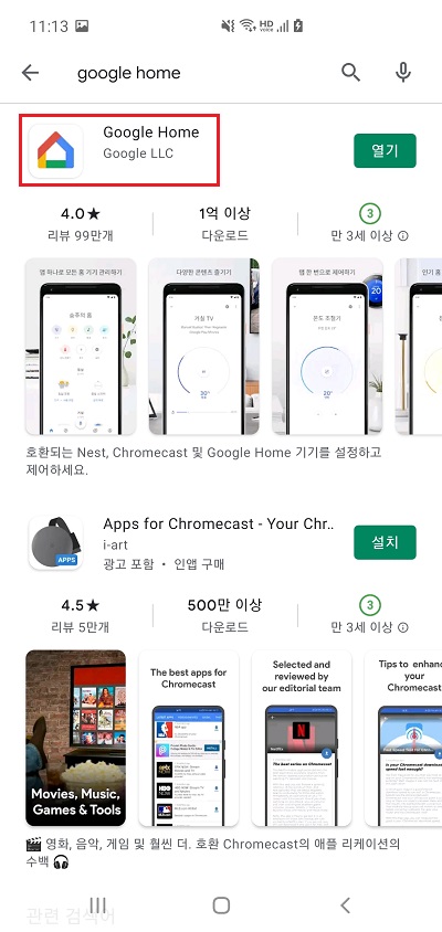 크롬캐스트 기능을 사용하려면 핸드폰에 Google Home 앱이 설치되어 있어야 한다.