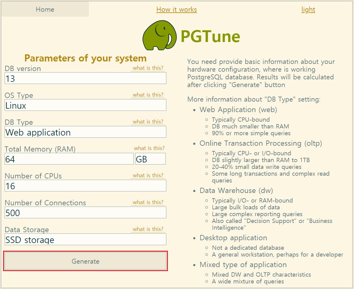 해당 설정값을 입력한 뒤 "Generate" 버튼을 클릭하면 권장 파라미터 값이 표시된다.