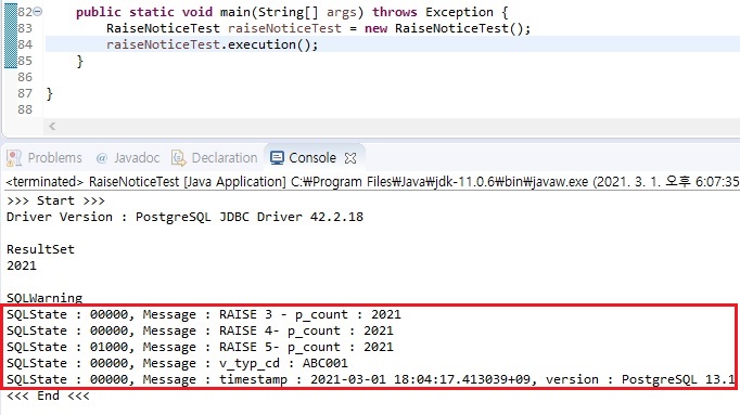 자바에서는 postgresql function 을 실행할때 SQLWarning(JDBC) 클래스를 사용하여 raise notice 의 문구를 가져올 수가 있다.