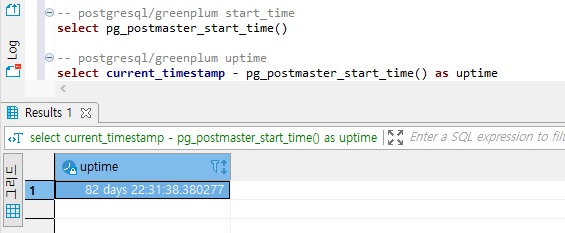 현재 서비스중인 postgresql/greenplum 을 현재 구동되었는지 확인할때 사용하는 개념이 uptime 이고 함수는 pg_postmaster_start_time() 를 이용하면 쉽게 확인할 수 있다.