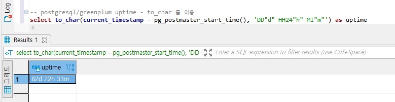 해당 postgresql 의 db 구동시간은 82일 22시간이 지나고 있는 것을 확인 할 수 있다.