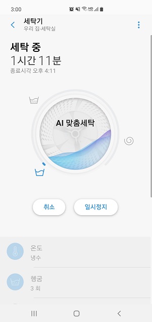 세탁중인 화면을 확인할 수 있으며 세탁을 취소하거나 일시정지를 할 수 있다.
