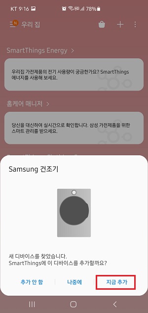 세탁기 설정이 완료되면 자동으로 건조기를 추가하는 화면이 표시된다.