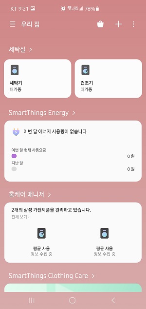세탁기/건조기 등록이 완료된 SmartThings 앱 메인화면