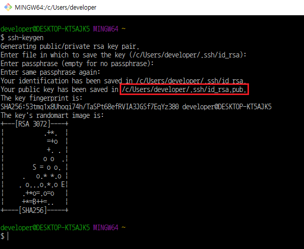 2) Enter file in which to save the key -> 공개키 생성 위치 - 기본경로로 생성하기 때문에 엔터