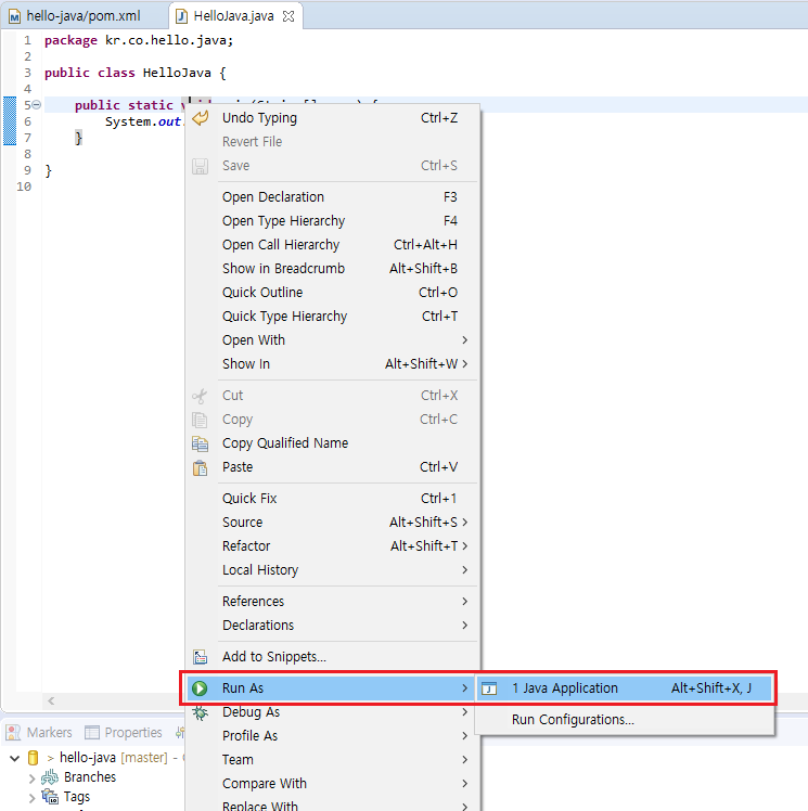 해당 자바파일 우클릭 > Run As > Java Application