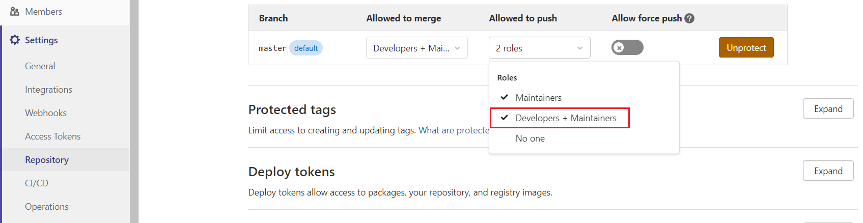 개발자(developer)가 master 브랜치를 push 하게 해주는 권한을 부여하는 부분이다.