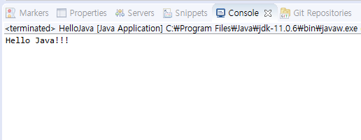 코드 개발 후 자바 어플리케이션을 실행하면 Hello Java!!! 문구를 Console 창에서 확인할 수 있다.