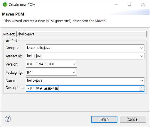 Group Id 는 원래 유니크한 패키지명(org.apache, com.sun.java 등)을 입력하는데 Maven Central 에 등록하지 않고 간단한 예제 프로젝트이기 때문에 kr.co.hello.java 로 지정하였다.